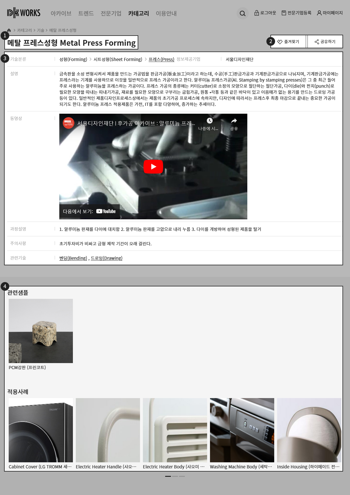 | 금속판을 소성 변형시켜서 제품을 만드는 가공법을 판금가공(板金加工)이라고 하는데, 수공(手工)판금가공과 기계판금가공으로 나눠지며, 기계판금가공에는 프레스라는 기계를 사용하므로 이것을 일반적으로 프레스 가공이라고 한다. 알루미늄 프레스가공(Al. Stamping by stamping presses)은 그 중 최근 들어 주로 사용하는 알루미늄을 프레스하는 가공이다. 프레스 가공의 종류에는 커터(cutter)로 소정의 모양으로 절단하는 절단가공, 다이(die)와 펀치(punch)로 필요한 모양을 따내는 따내기가공, 재료를 필요한 모양으로 구부리는 굽힘가공, 원통 •각통 등과 같은 바닥이 있고 이음매가 없는 용기를 만드는 드로잉 가공 등이 있다. 일반적인 제품디자인프로세스상에서는 제품의 초기가공 프로세스에 속하지만, 디자인에 따라서는 프레스후 최종 마감으로 끝내는 중요한 가공이 되기도 한다. 알루미늄 프레스 적용제품은 가전, IT를 포함 다양하며, 증가하는 추세이다. |