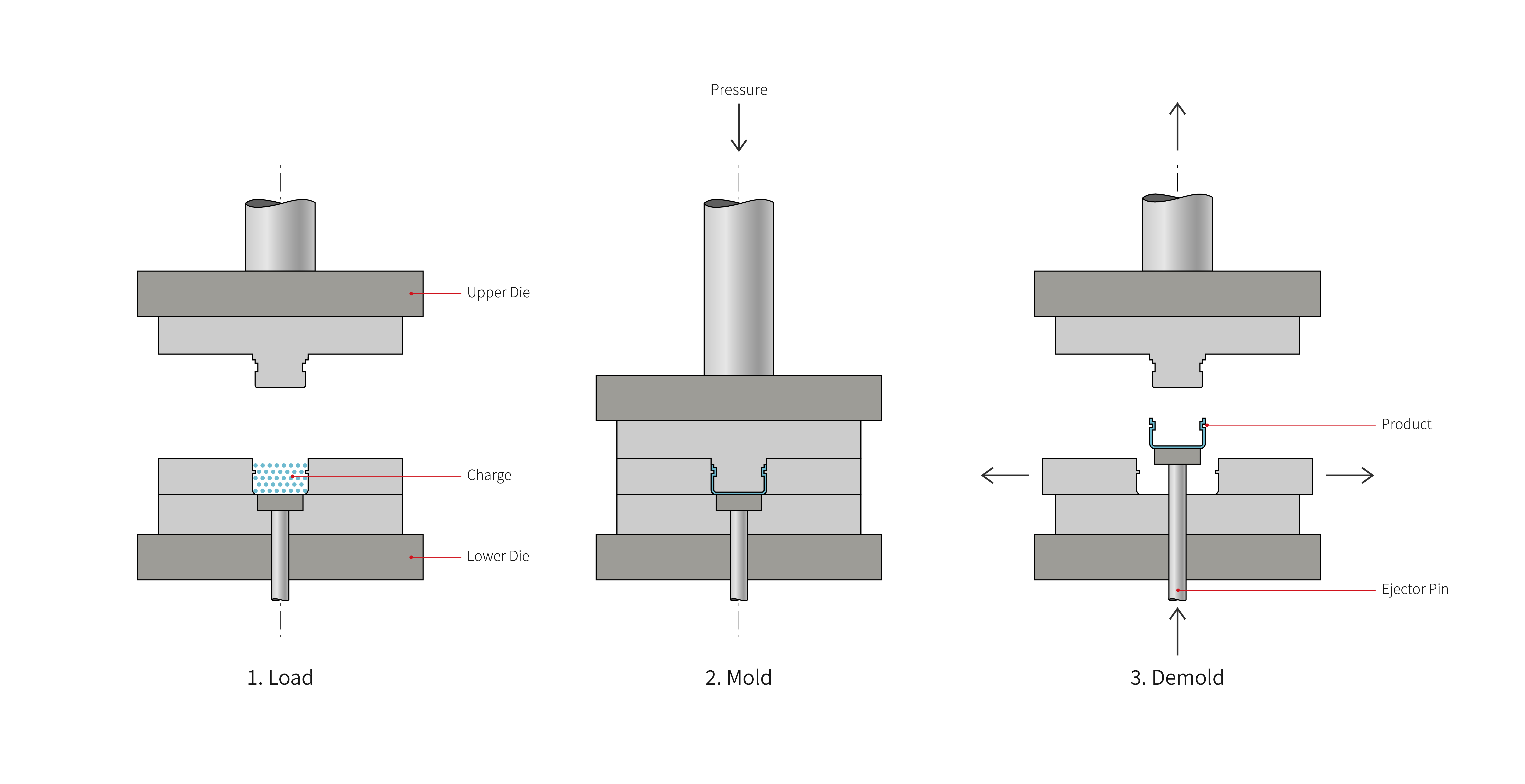 | 1. 고분자 알갱이 또는 수지와 경화제를 포함한 형태로 가열된 몰드에 놓는다. 2. 몰드가 닫히면서 고분자를 몰드 공간으로 밀어넣는다. 3. 고분자가 경화 된 뒤에 몰드를 연다. |