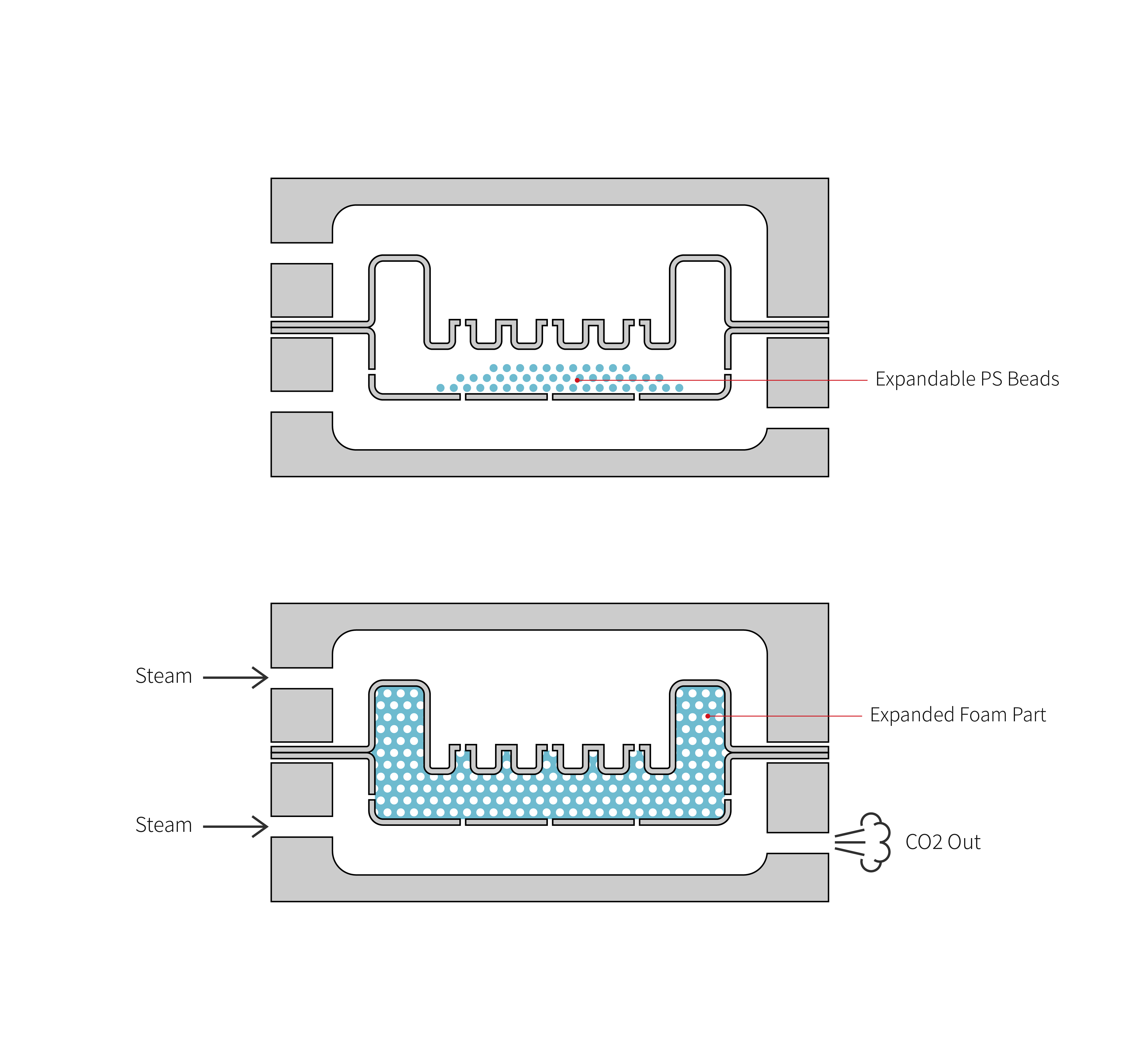 | 부피는 20배 이상 늘어나며, 낮은 온도와 압력의 공정이기에 비용은 저렴하다. 몰드와 닿은 제품의 부위는 매끈하게 제작되며 2mm보다 큰 경우 디테일한 형상을 만들 수 있다. 재활용이 가능하며 포장재에 주로 사용되나, 복잡한 형상과 음향 특성, 가벼움, 시각적 특성으로 인해 다양한 분야에서 사용되고 있다. 하지만 쉽게 손상될 수 있기에 적용에 있어 주의가 필요하다. |