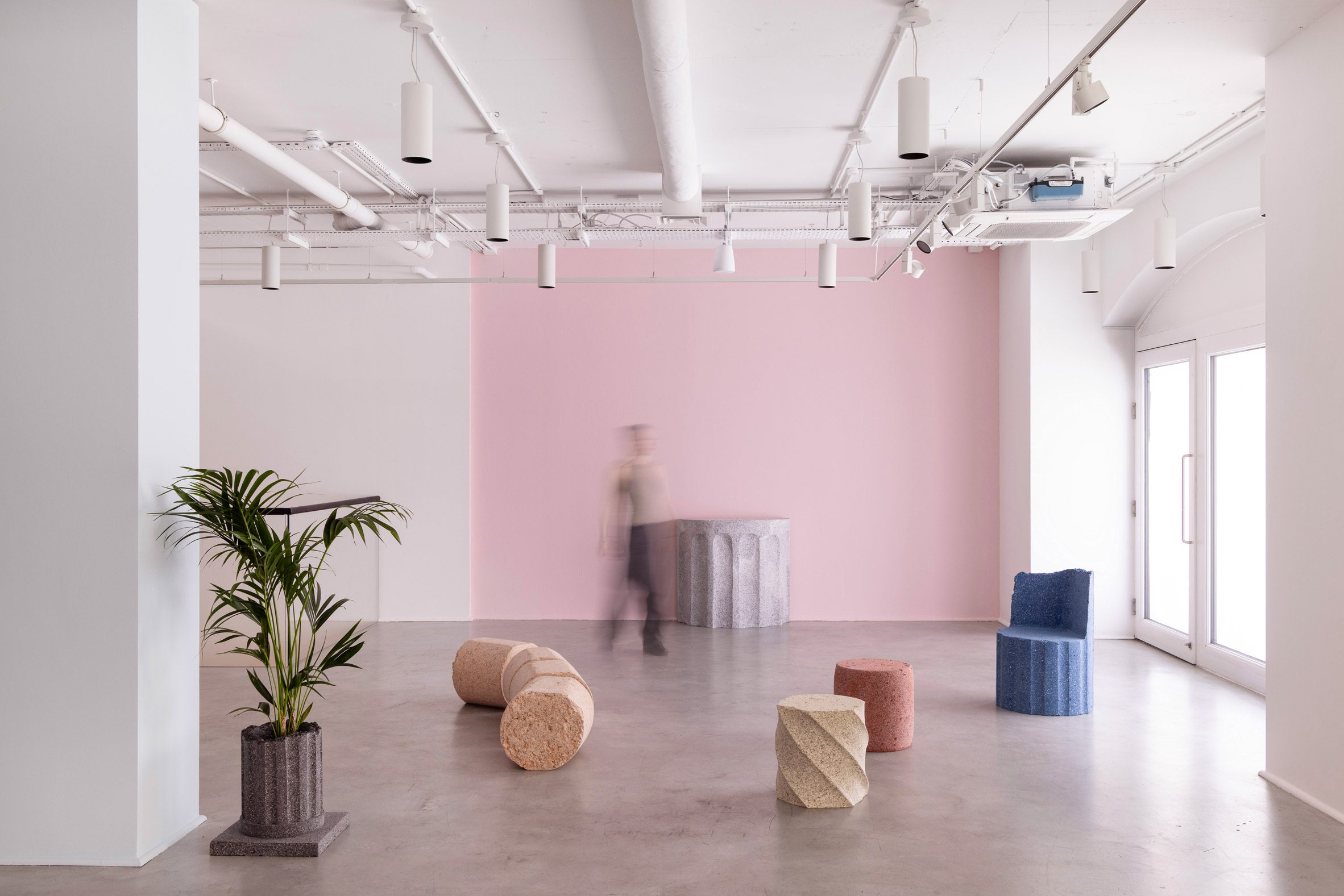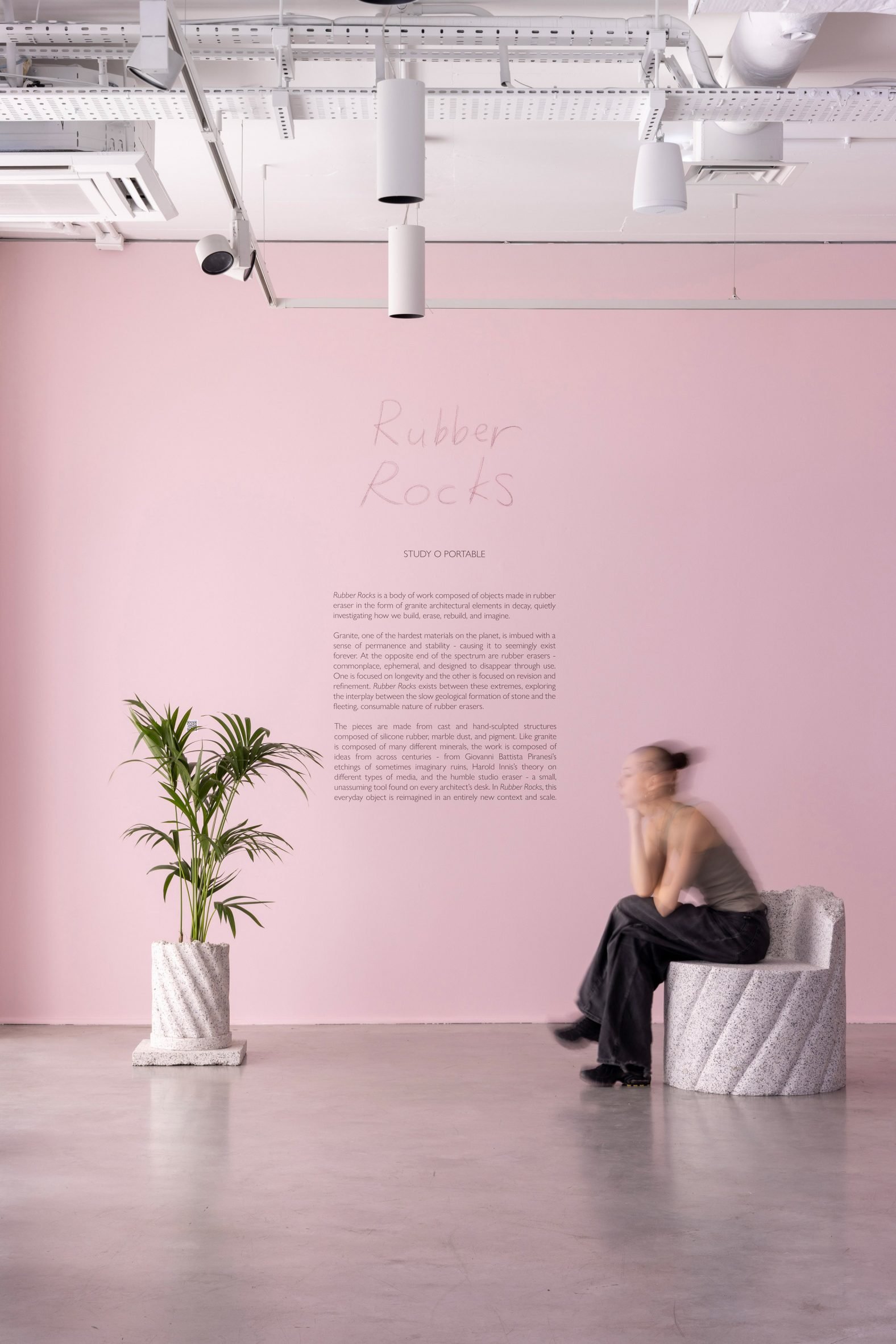 런던의 디자인 스튜디오 스터디 오 포터블(Study O Portable)은 고무로 제작되었지만 "풍화된 건축 요소"를 연상시키는 가구 컬렉션 러버 록스(Rubber Rocks)를 갤러리 후미(Gallery Fumi)를 위해 선보였다.